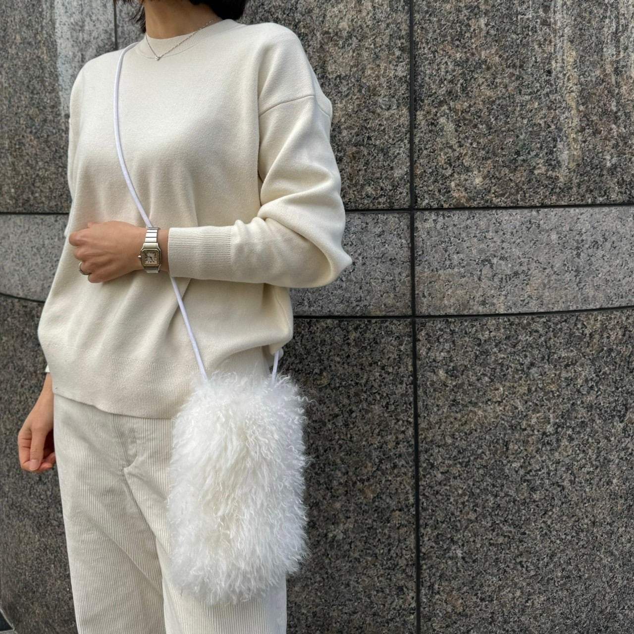 カシミヤファーの縦型ショルダーバッグ